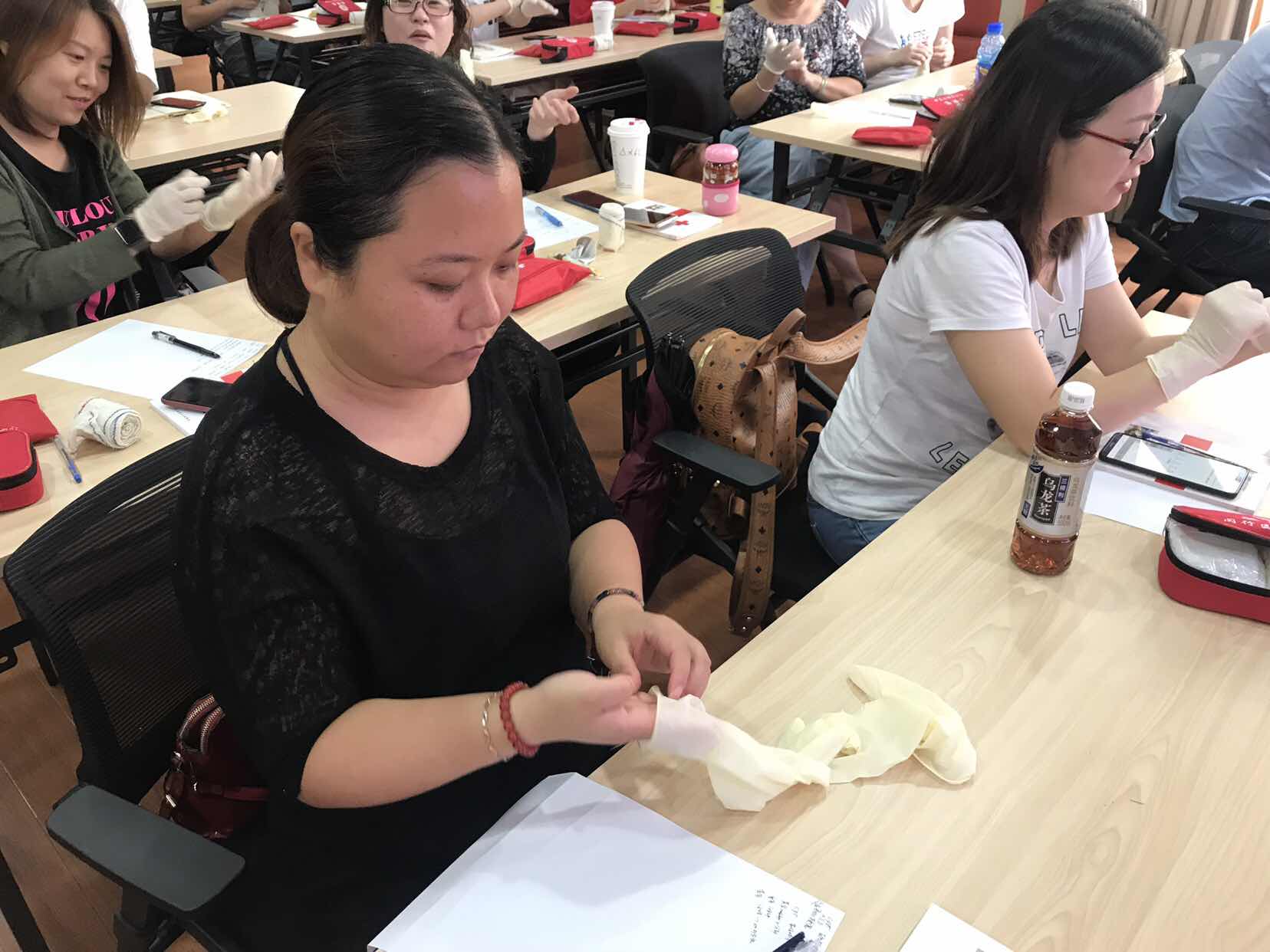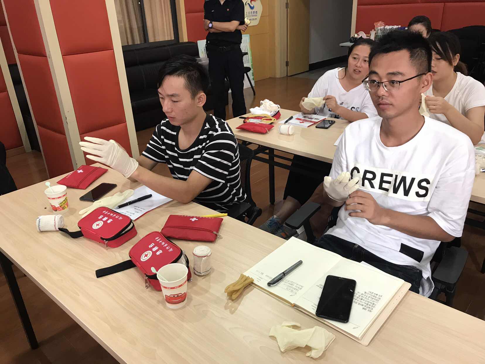 培訓(xùn)教官?gòu)募t會(huì)的起源以及智能介紹開(kāi)始了上午的培訓(xùn),從場(chǎng)景模擬舉例,講述現(xiàn)場(chǎng)救護(hù)的步驟,從救護(hù)特點(diǎn)、原則、評(píng)估、注意事項(xiàng)、救護(hù)步驟逐一細(xì)致講解。在培訓(xùn)過(guò)程中,用理論實(shí)操相結(jié)合的模式,講述完整流程及急救人防護(hù)演示,演示了穿戴手套,檢查意識(shí)、呼吸、脈搏操作要領(lǐng),并不時(shí)的為學(xué)員強(qiáng)調(diào)自我保護(hù)。學(xué)員也隨堂練習(xí)了穿戴手套的正確方法。