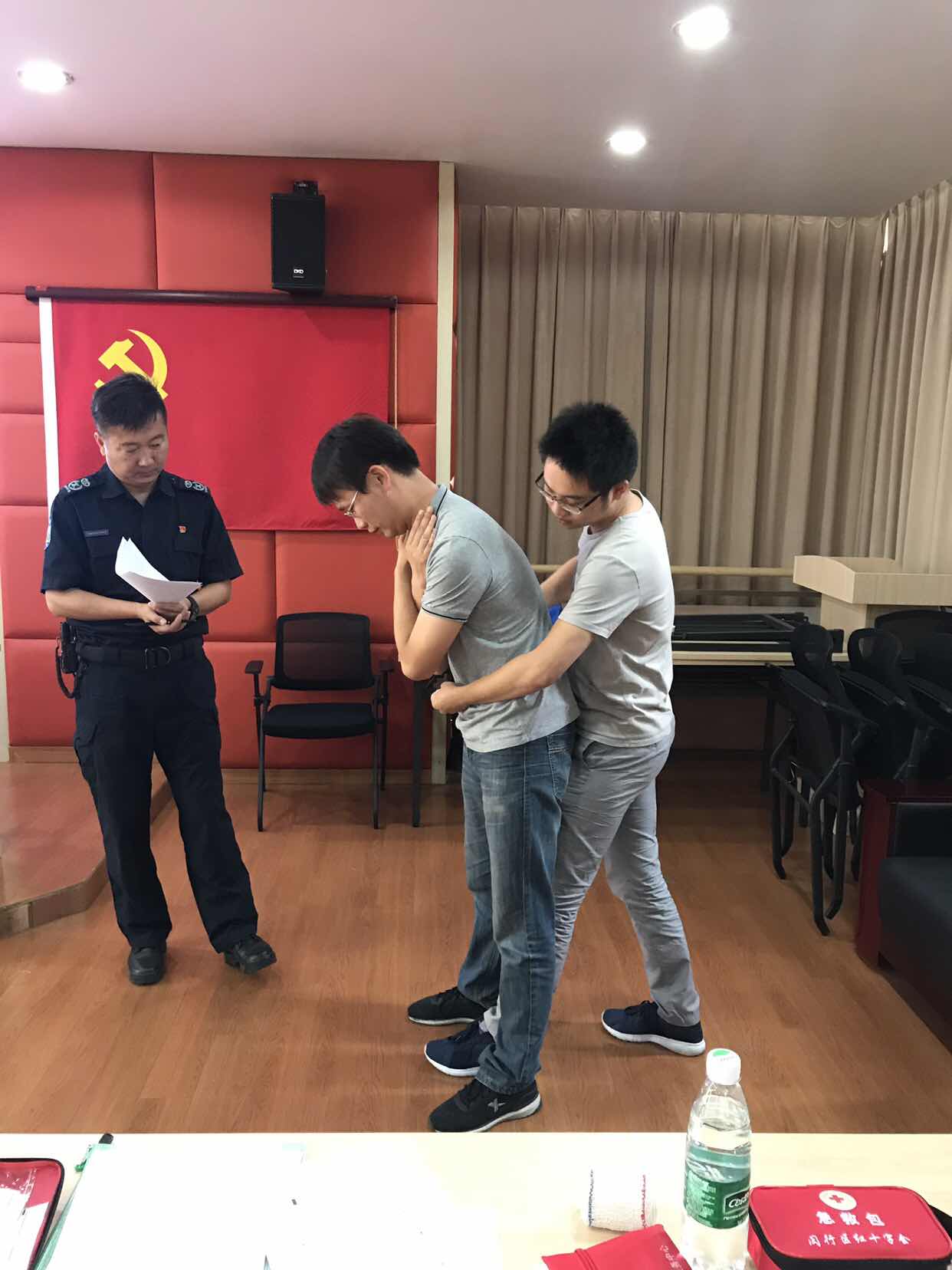 用真實(shí)案例代入,模擬異物梗阻的正確處理方式,教官與助教配合用海氏手法示范成人及嬰幼兒的不同操作規(guī)范流程,及獨(dú)自一人時(shí)異物梗阻的自救方法示范,隨后學(xué)員兩兩練習(xí)并進(jìn)行考核。