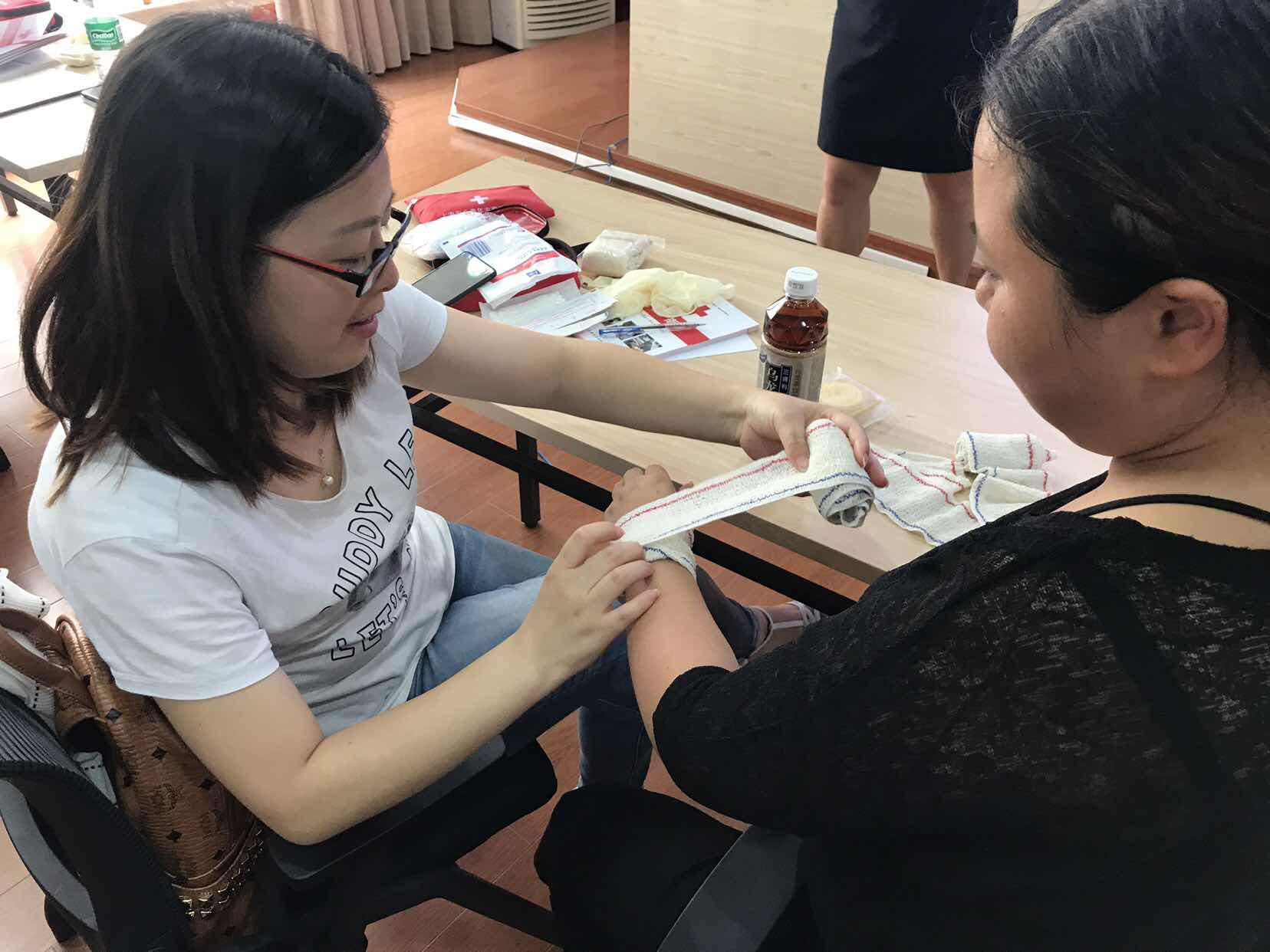 在下午的課程中,從創(chuàng)傷救護(hù)的目的與程序講述了止血方法的種類(lèi),示范了紗布止血及結(jié)合繃帶、三角巾的使用,教官除了用實(shí)操中的經(jīng)驗(yàn)培訓(xùn)外,更用實(shí)戰(zhàn)案例,來(lái)教授各種身體部位的止血包扎細(xì)節(jié)及注意事項(xiàng)。學(xué)員練習(xí)之后對(duì)創(chuàng)傷包扎進(jìn)行了考核。