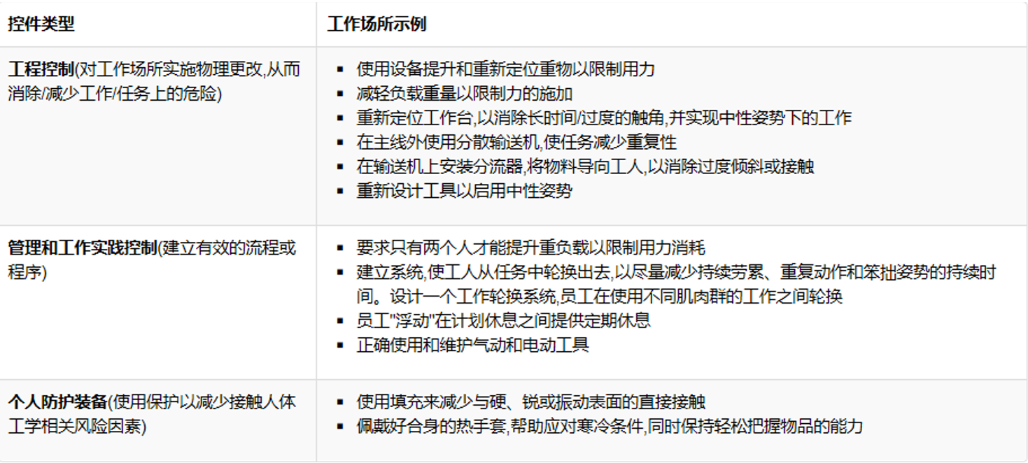 肌肉骨骼疾病(MSD)危險控制概述 為了減少受傷的機會,應設計工作任務以限制接觸人體工學風險因素。在可能的情況下,工程控制是最可取的。在某些 情況下,如果無法實施工程控制,或者在實施新的工程控制后需要不同的程序,則管理或工作實踐控制可能適用。個人防 護解決方案在處理人體工程學危害時效果有限。